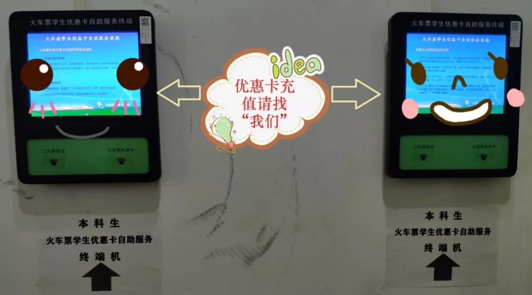 两校区优惠卡充值均采用学生前往“火车票学生优惠卡自助服务终端”充值的方式进行。点击自助终端屏幕“购票次数充值”,按照屏幕提示在右下方刷学生优惠卡,显示当前优惠卡信息,并显示已充值情况记录,确认无误后充值。学生一学年中已充值一次,再次充值时提示:该学年已充值,不能再次充值。
