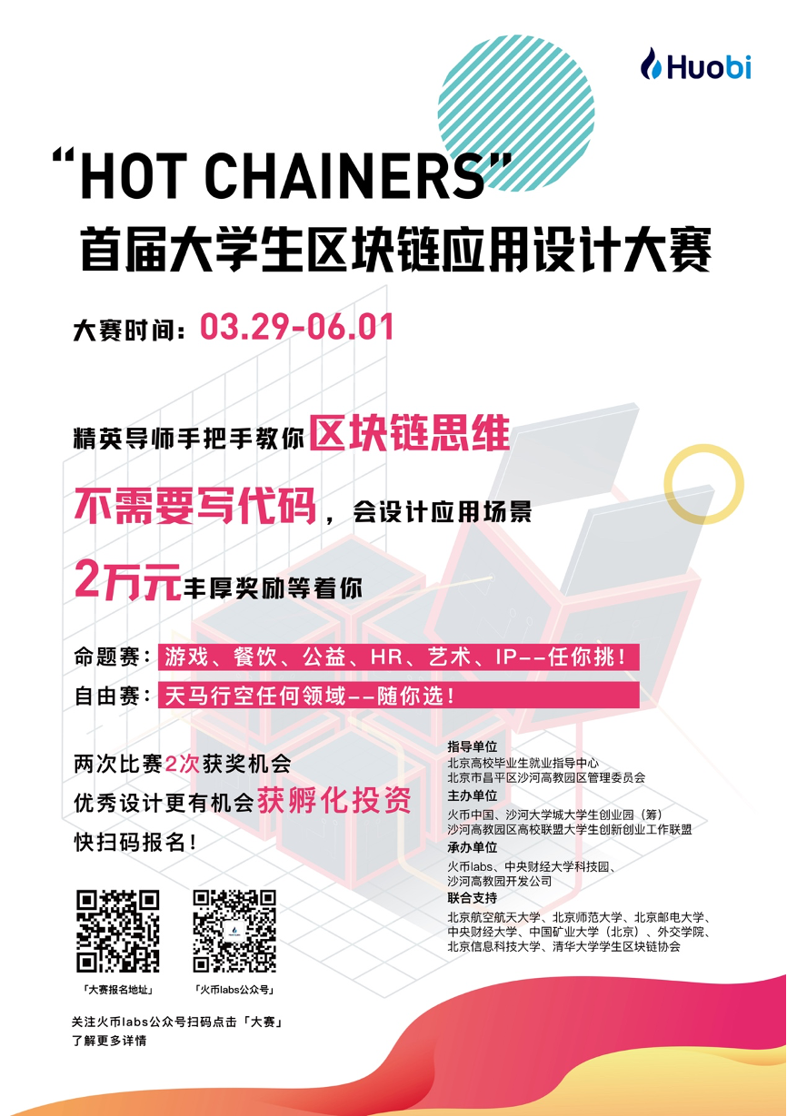 大赛是由北京高校毕业生就业指导中心、沙河高教园区管理委员会作为指导单位;米兰milan官方网站科技园、沙河高教园开发公司、火币Labs共同承办;北京航空航天大学、北京师范大学、北京邮电大学、米兰milan官方网站、中国矿业大学(北京)、外交学院、北京信息科技大学、清华大学学生区块链协会等单位联合支持。大赛报名可通过微信公众号“区块链创新工场”-“大赛”栏目报名参与。
