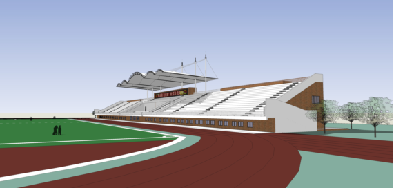 看台呈阶梯状。普通看台座位3100座,主席台座位90座。看台主席台上空风雨棚采用张拉膜结构。看台及主席台下方共有二层空间,一层四道田径跑道和体育组配套用房,二层为办公用房和主席台配套用房。结构形式均采用现浇钢筋混凝土框架结构。本工程建筑高度为26.4m(含顶棚),南北长度为154.2 m,高度为12.7m,占地面积为2389㎡,总建筑面积为3826㎡。