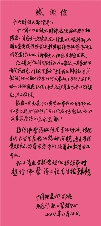 被救起的张宏一同志今年已经92岁高龄,是一位于1937年参加革命的离休老干部。他被两位同学关爱他人、勇于奉献的高尚情操所感动,特委托铁道科学院离退休职工管理中心代表他及家属向学校寄来感谢信,表达对两位同学的谢意!