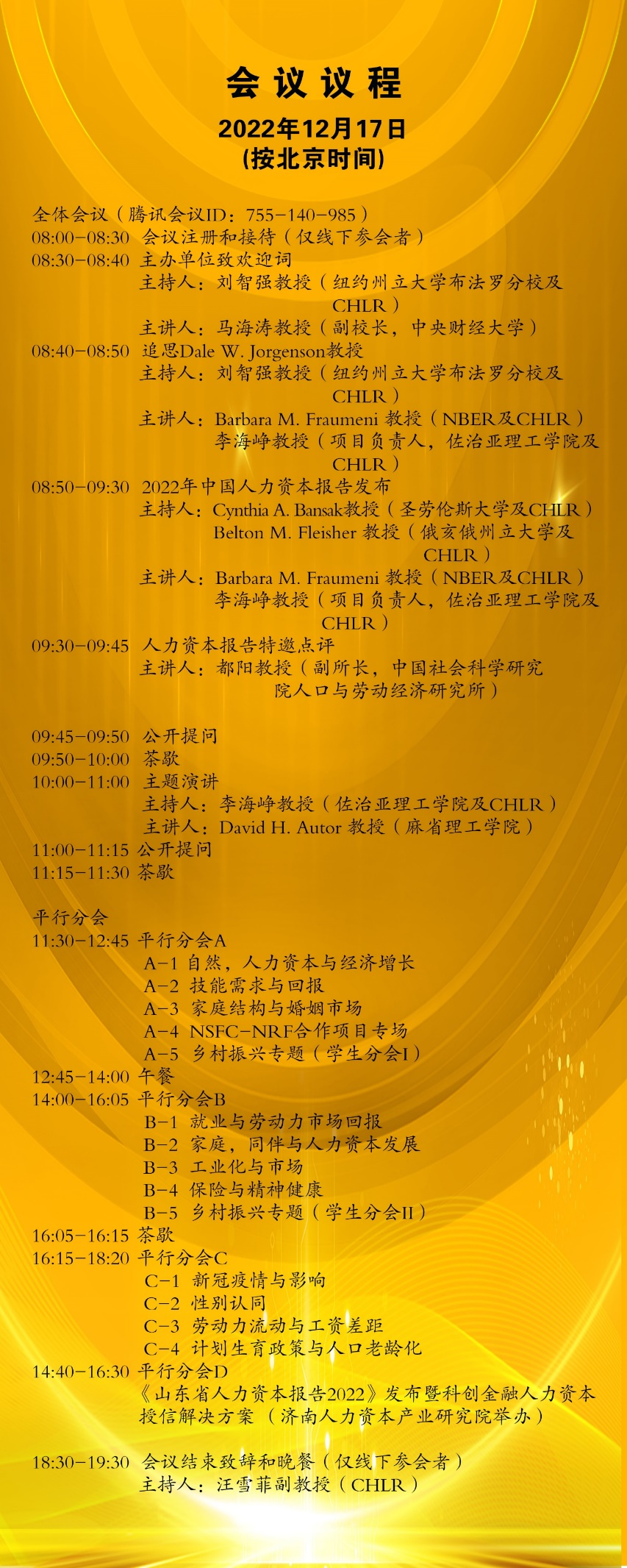 具体会议议程及分会安排,详见中心官方网站:Conference Program-China Center for Human Capital and Labor Market Research (cufe.edu.cn)
